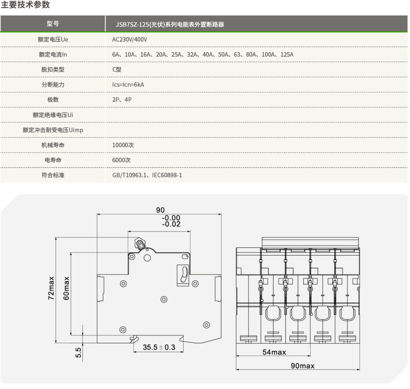 JSB7SZ-125(光伏)系列电能表外置断路器具备过、欠压保护,当电压恢复正常后能自动合闸。适用于交流 50H2 或 60Hz,额定工作电压为AC230V/400,额定电流 6A 至 125A 的线略中,同时对线路起过载和短路保护的作用,也可以作为线路的不频繁操作转换之用,是光伏并网专用断路器。